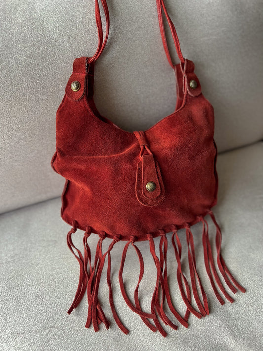 Czerwona torebka z frędzlami | zamsz naturalny