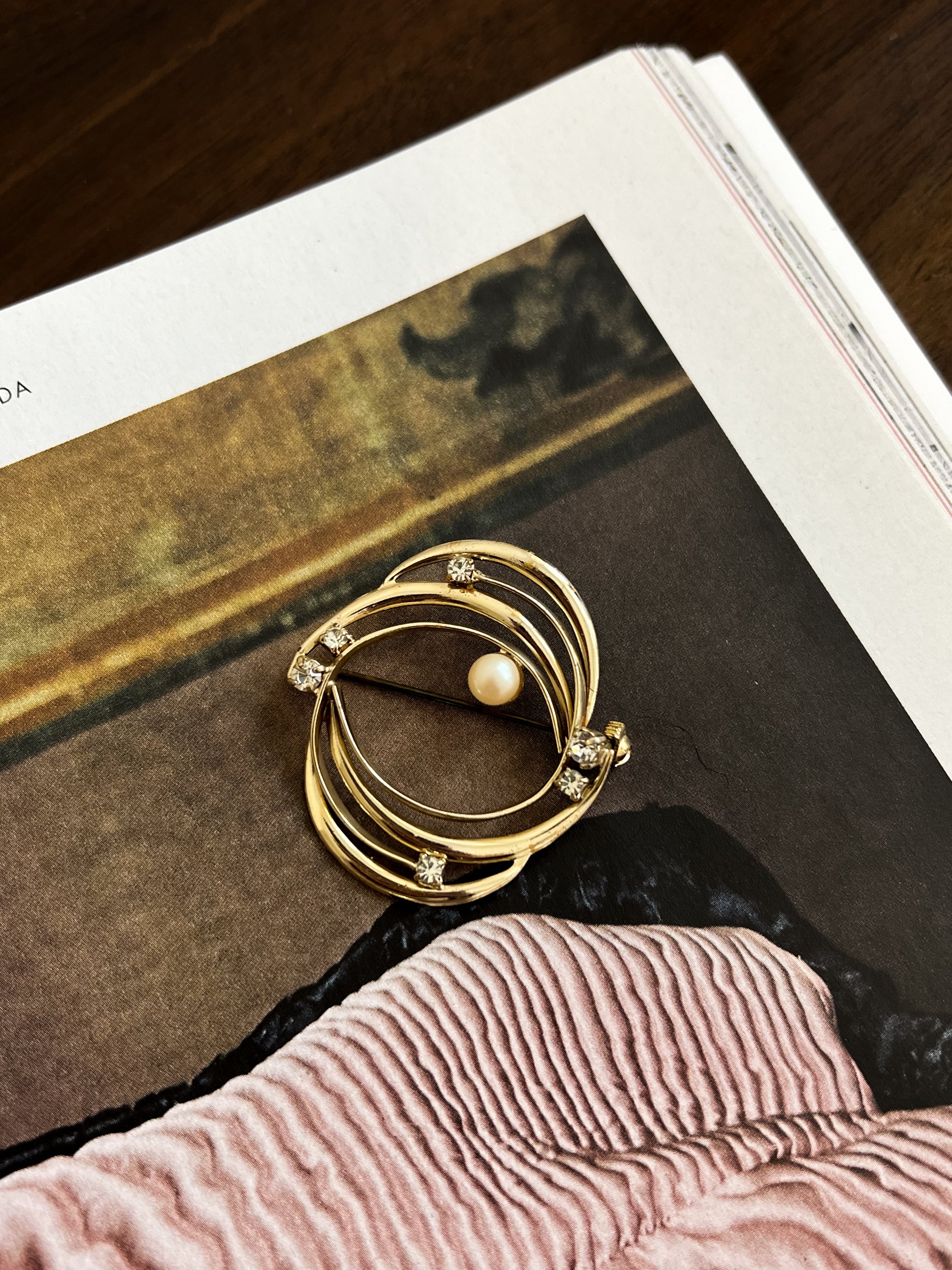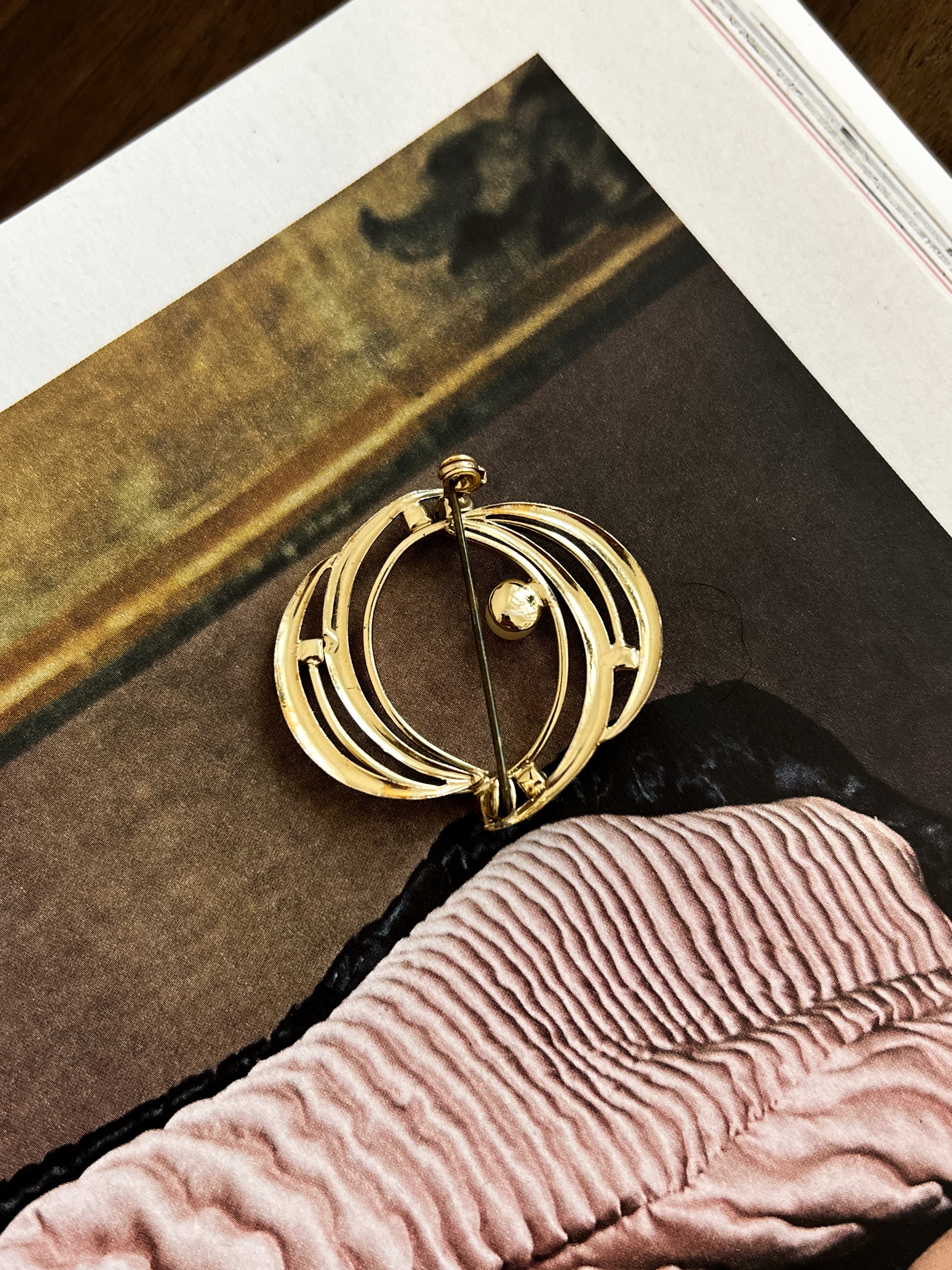 Lekka broszka o modernistycznej, ażurowej formie koła z centralną kulką. Wykonana z cienkiego, łatwo plastycznego metalu, typowego dla biżuterii kostiumowej z lat 70./80., kiedy popularne były lekkie, przestrzenne konstrukcje o geometrycznym charakterze. Delikatnie połyskuje i dodaje subtelnej elegancji.