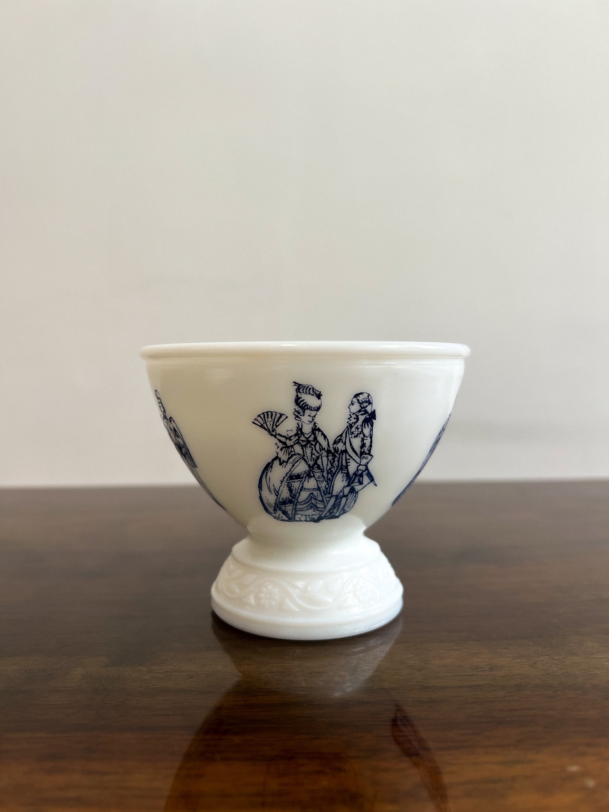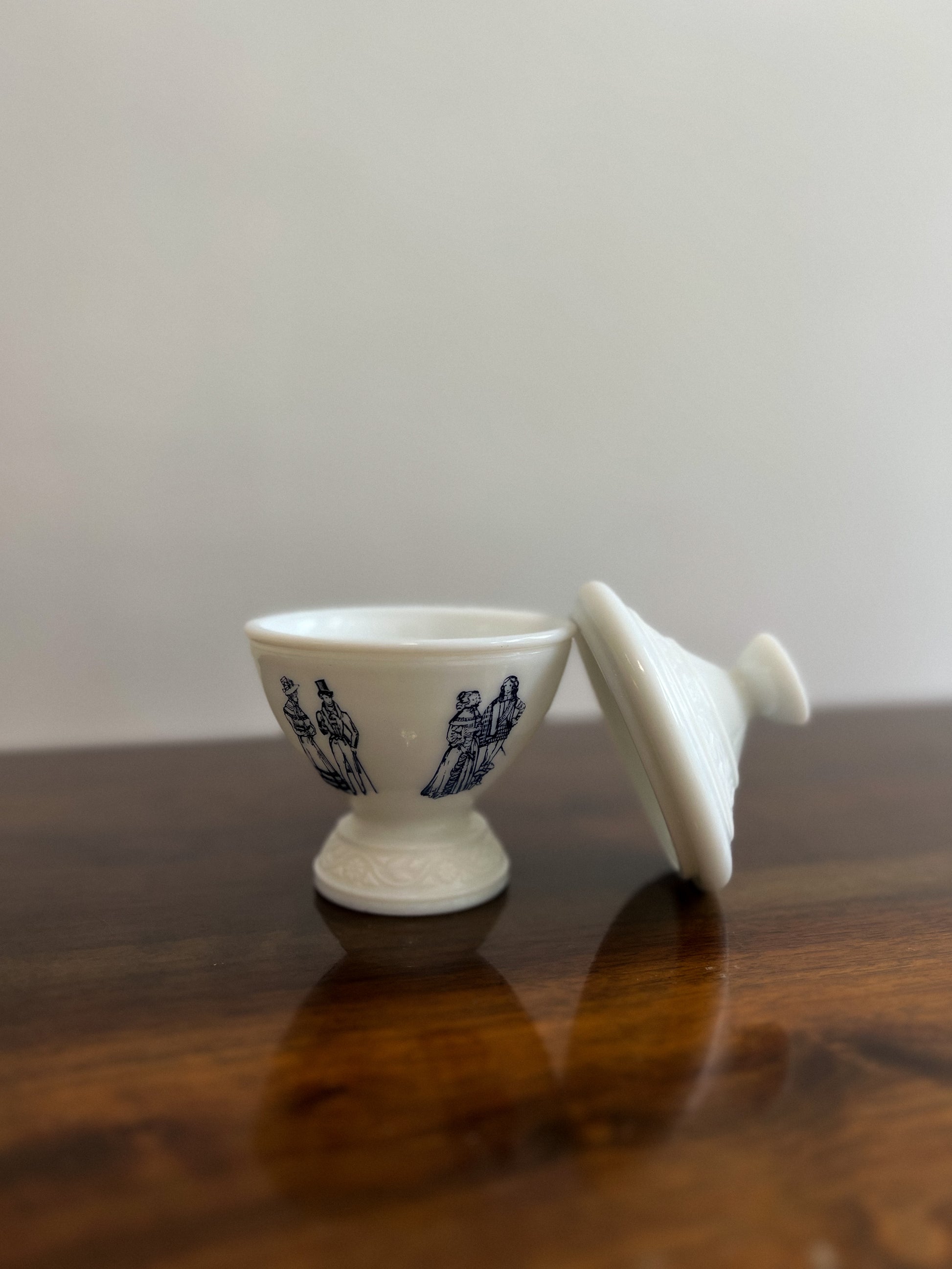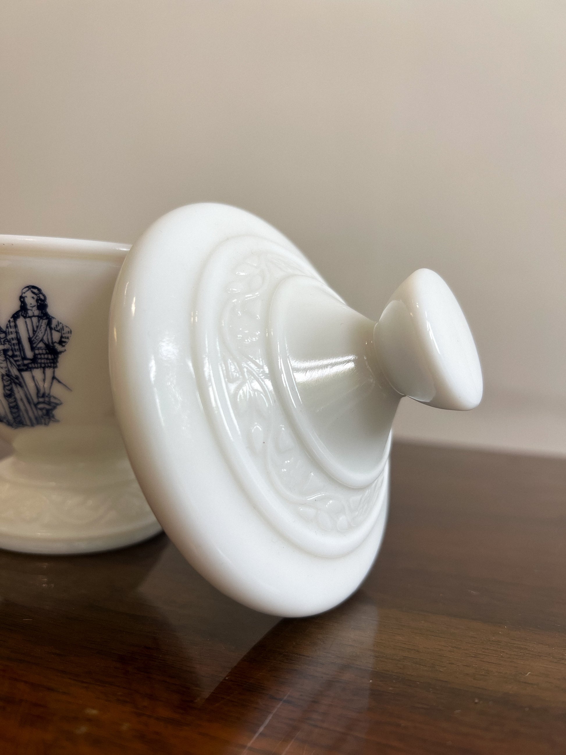 Eleganckie naczynie z mlecznobiałego szkła z pokrywką, ozdobione delikatnym kobaltowym motywem przedstawiającym postacie w historycznych strojach. Subtelny reliefowy wzór u podstawy i na pokrywce dodaje całości klasycznego charakteru.