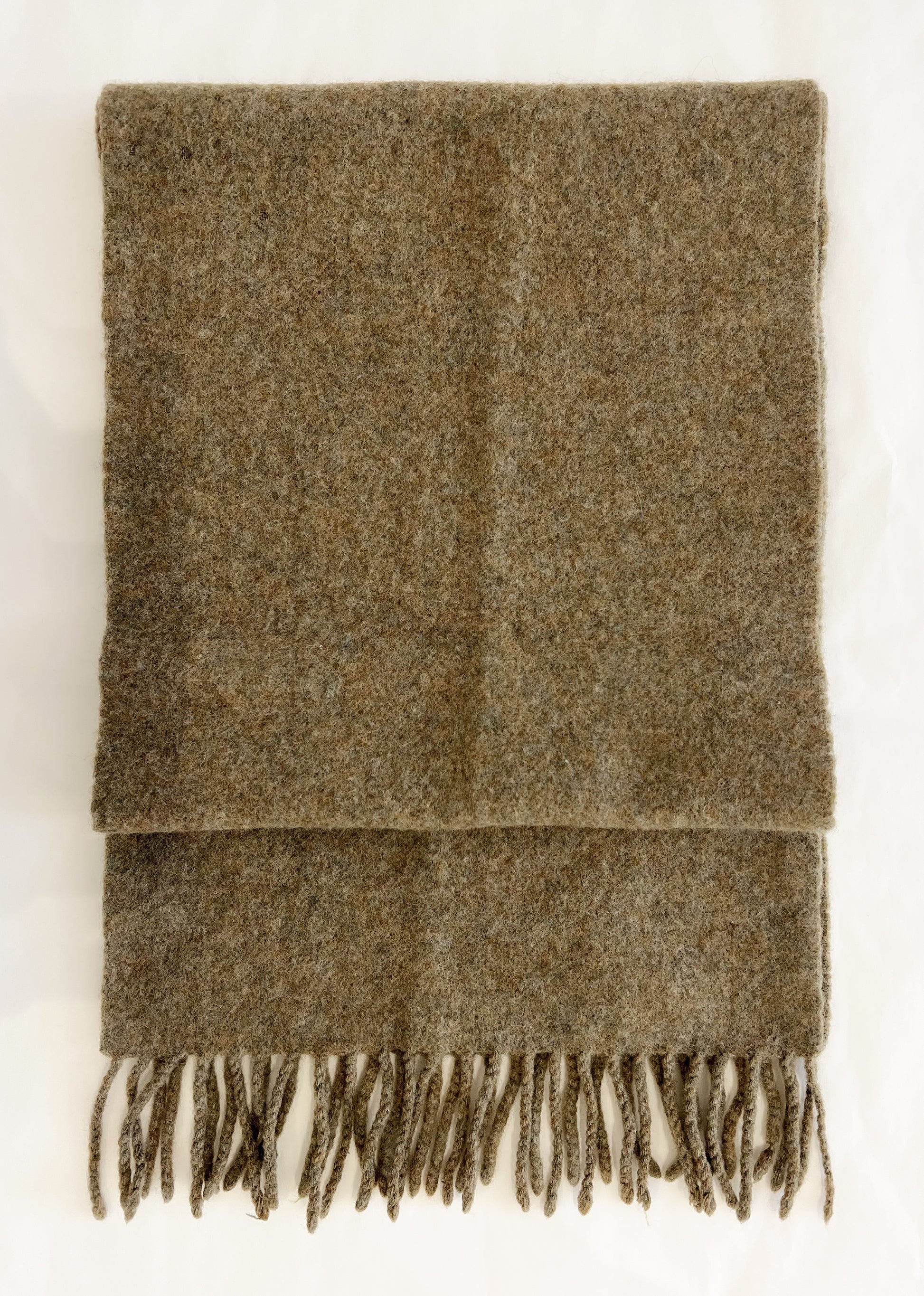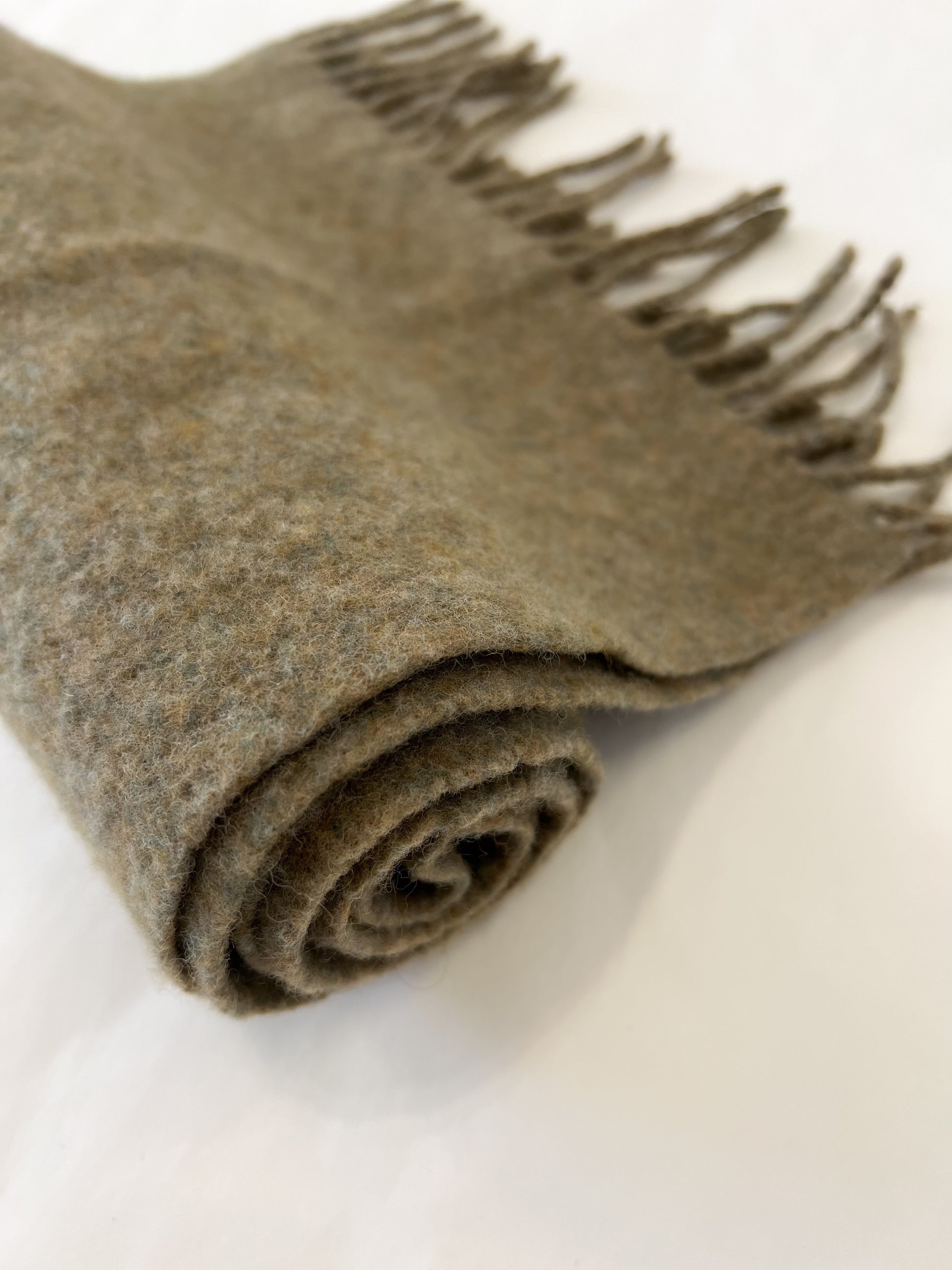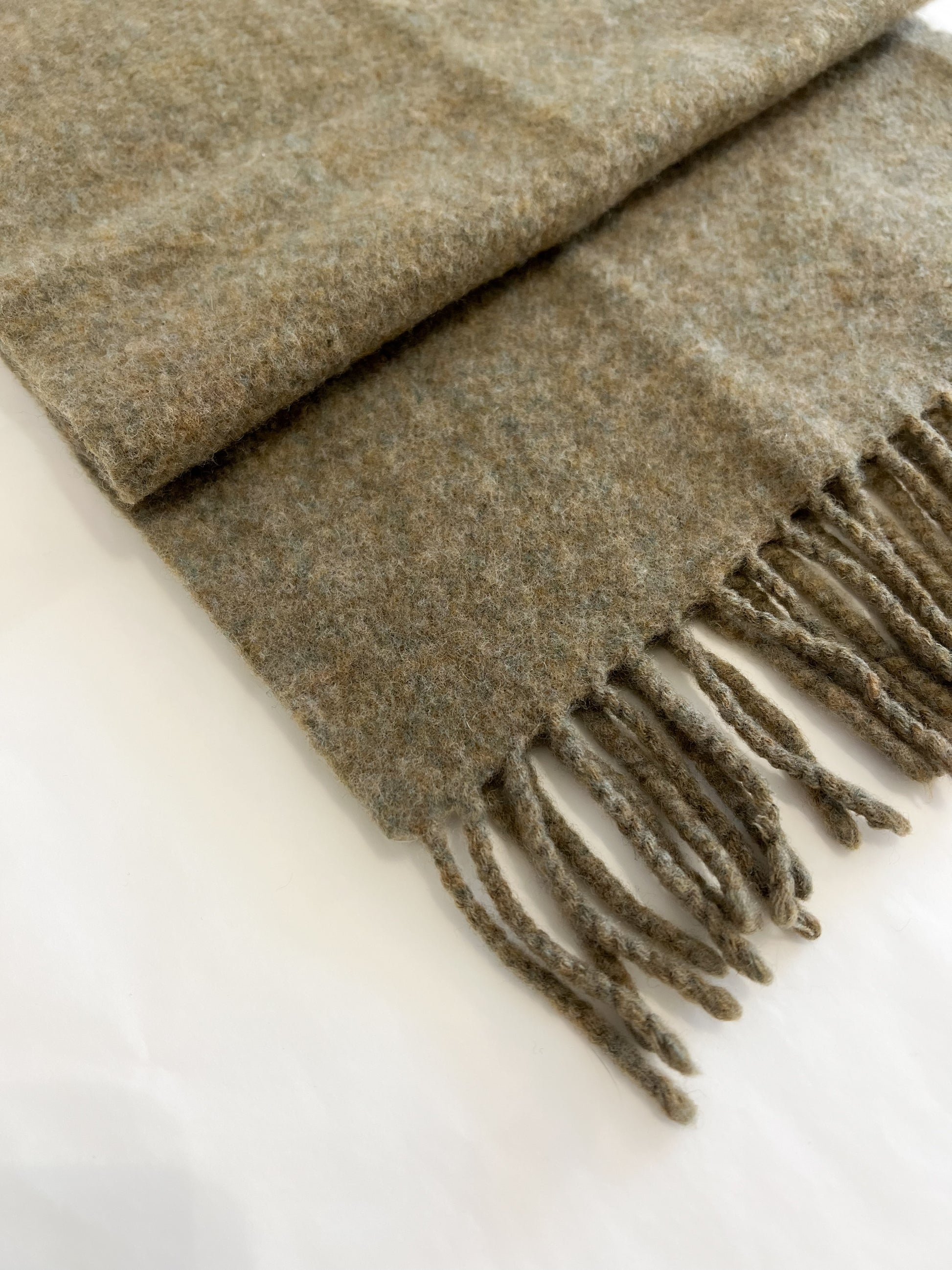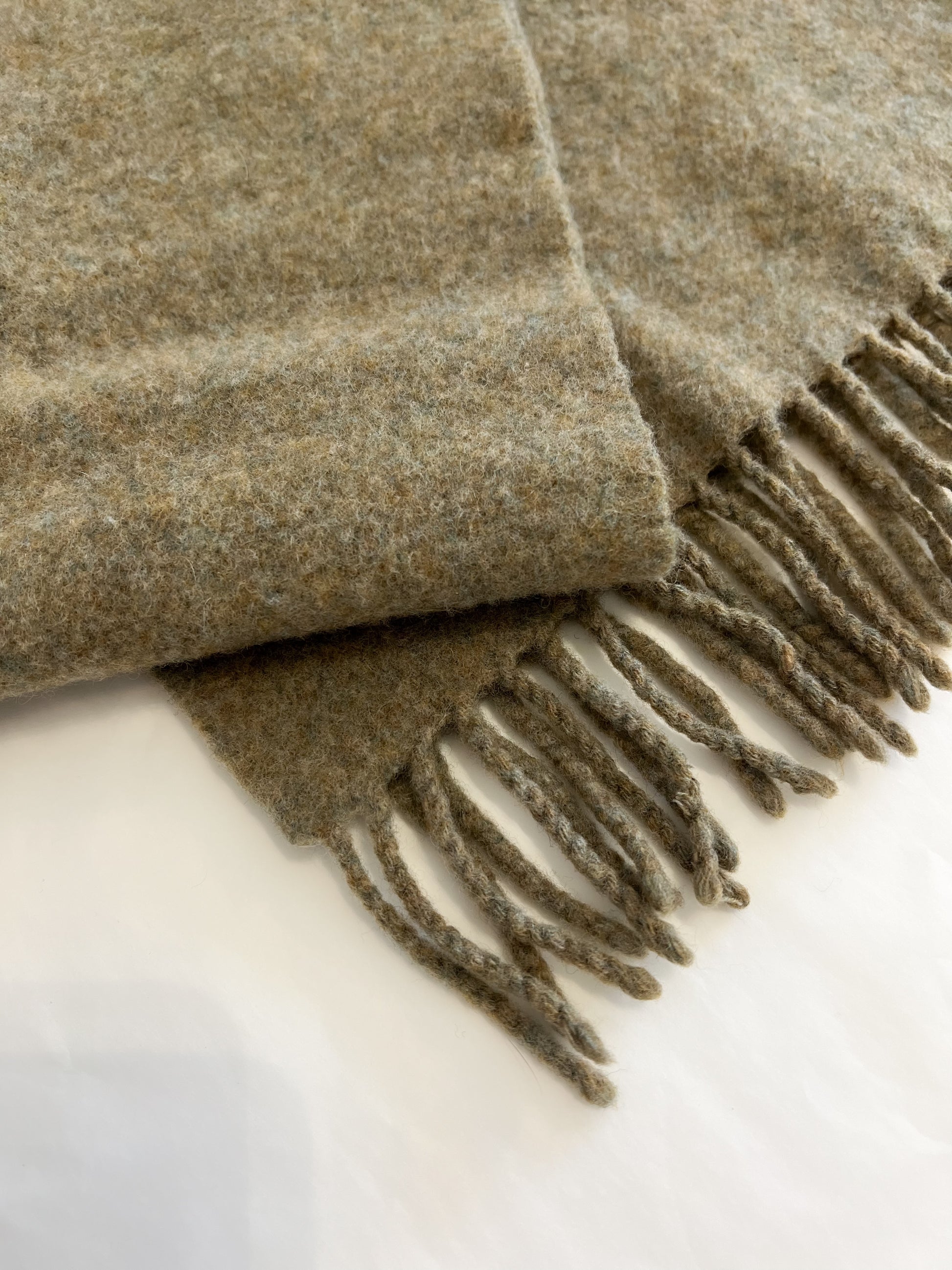 Bardzo krótki szalik w kolorze stonowanej oliwki. Grubszy i miękki. Nie podany skład, zdecydowanie wełna.