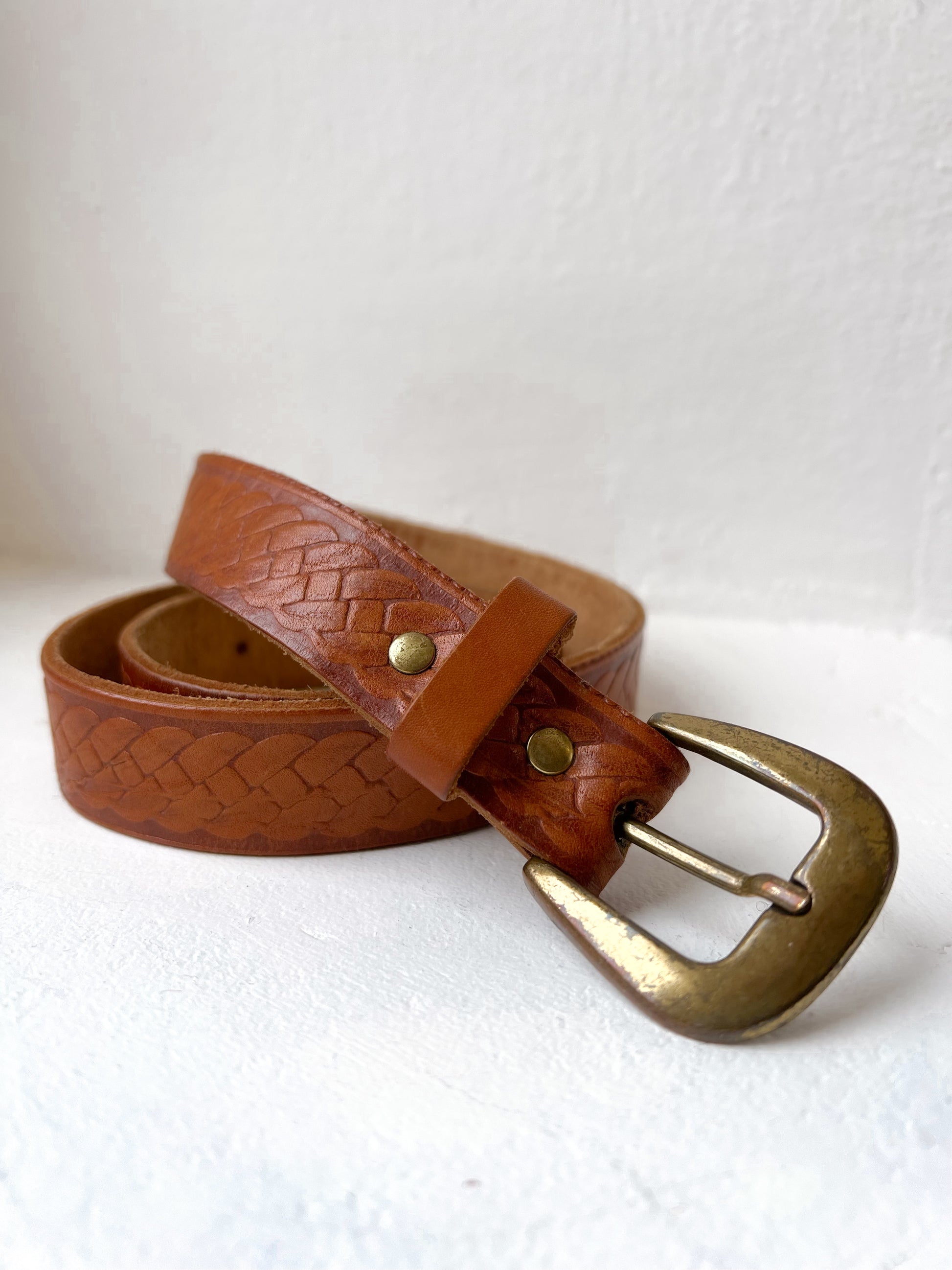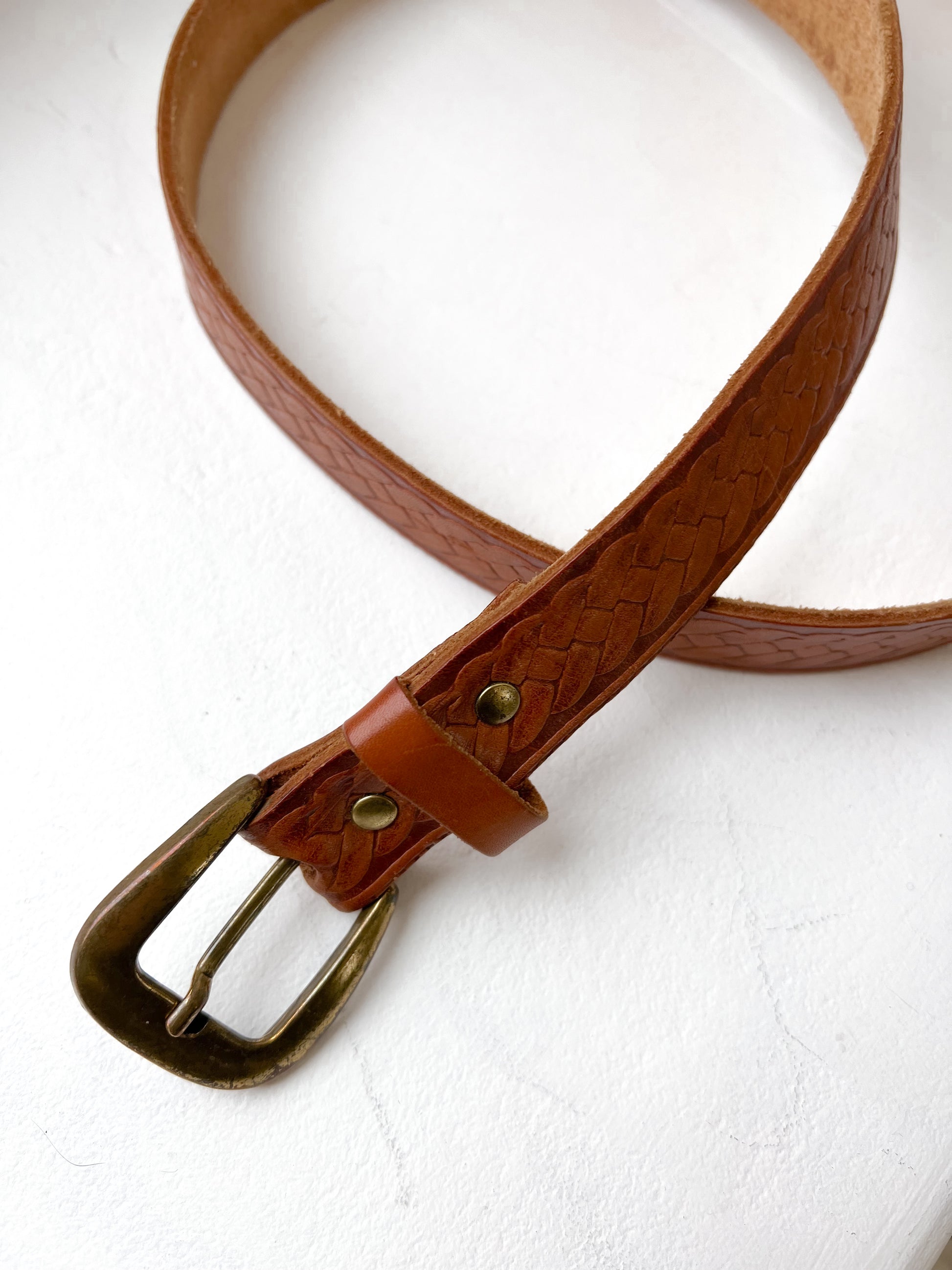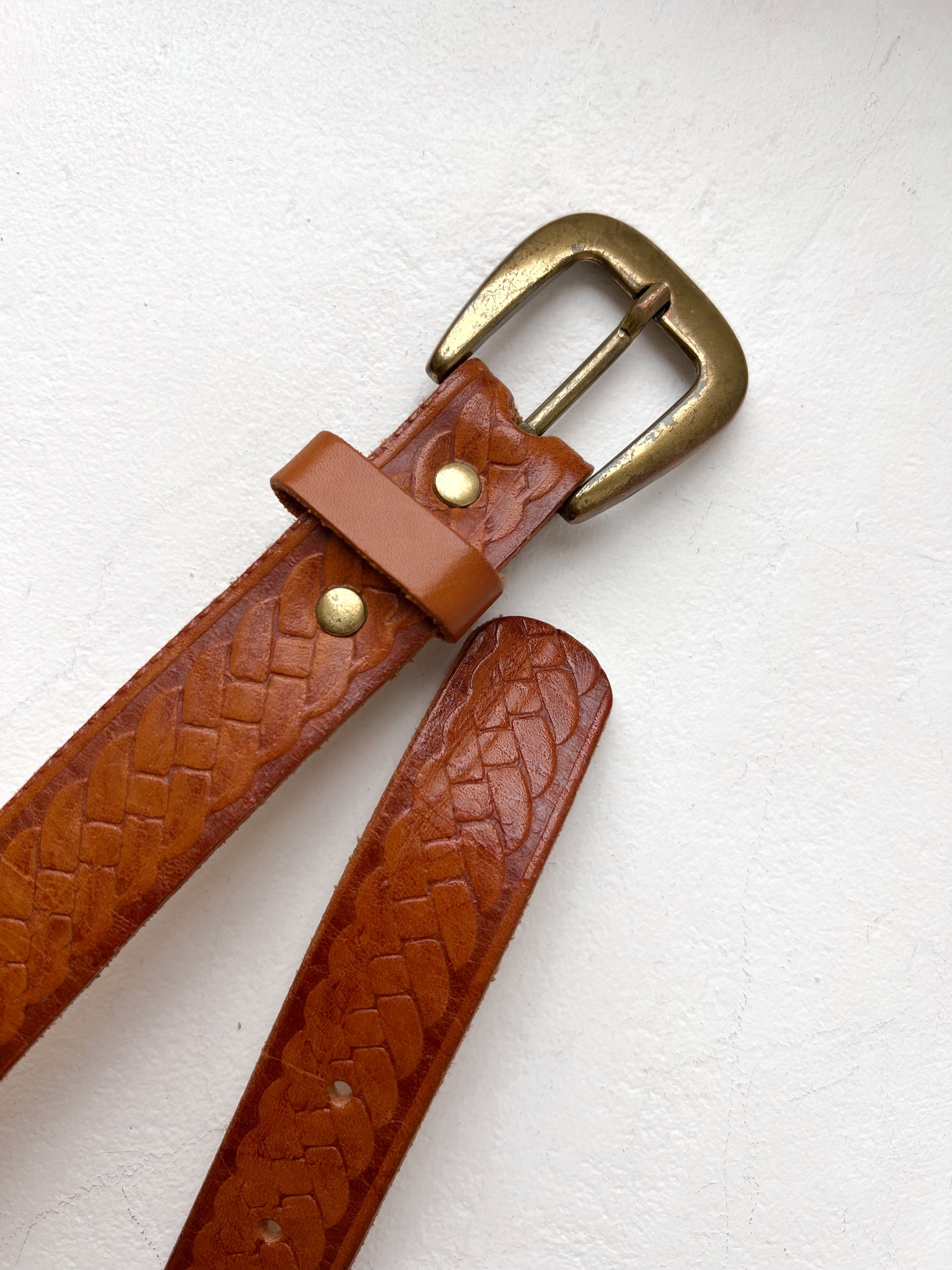 Pasek vintage zachowany w bardzo dobrym stanie. Wytłaczany wzorek. Naturalnie postarzany co dodaje mu uroku. Wykonany całościowo ze skóry naturalnej.