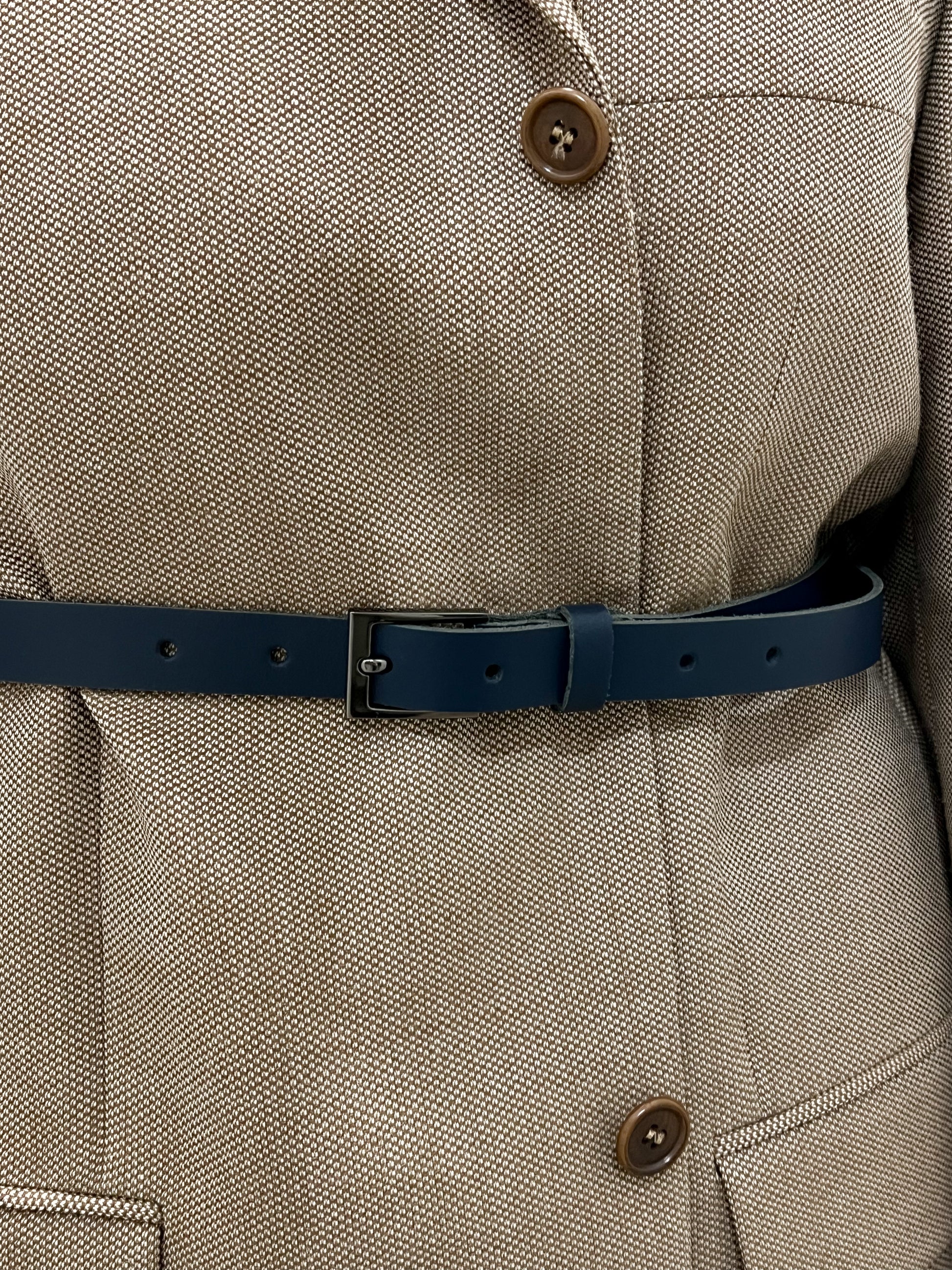 Elegancki pasek z naturalnej skóry w ciemnym odcieniu granatu, wykończony minimalistyczną srebrną klamrą. Stan jak nowy. Rozmiar z paska 90 cm. Made in Germany.