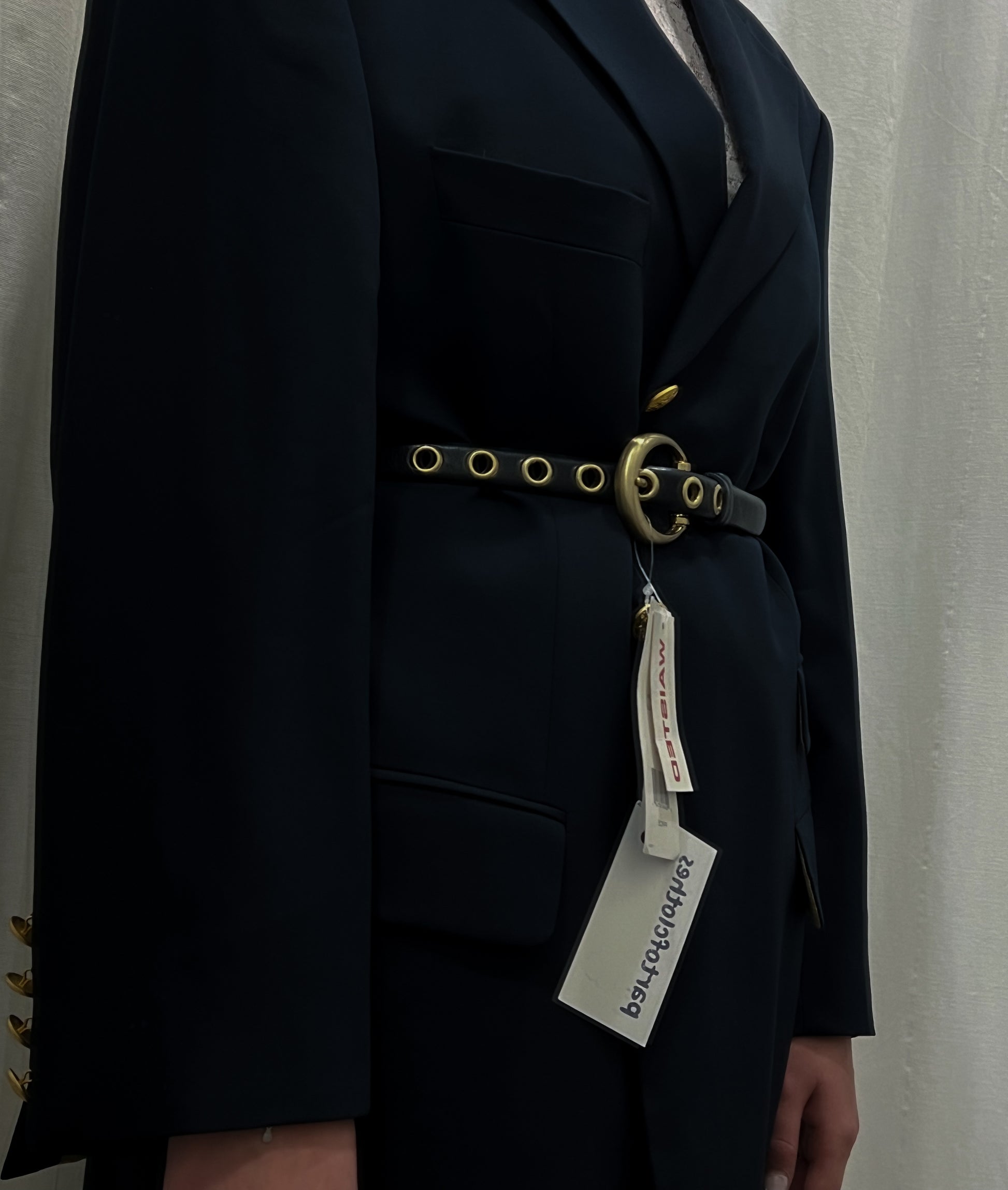 Skórzany pasek z wyrazistą, złotą klamrą. Oryginalnie w odcieniu ciemnego turkusu, obecnie subtelnie przyciemniony do głębokiej czerni, dzięki czemu zyskał unikalny, uniwersalny kolor, który będzie pięknie się starzał.