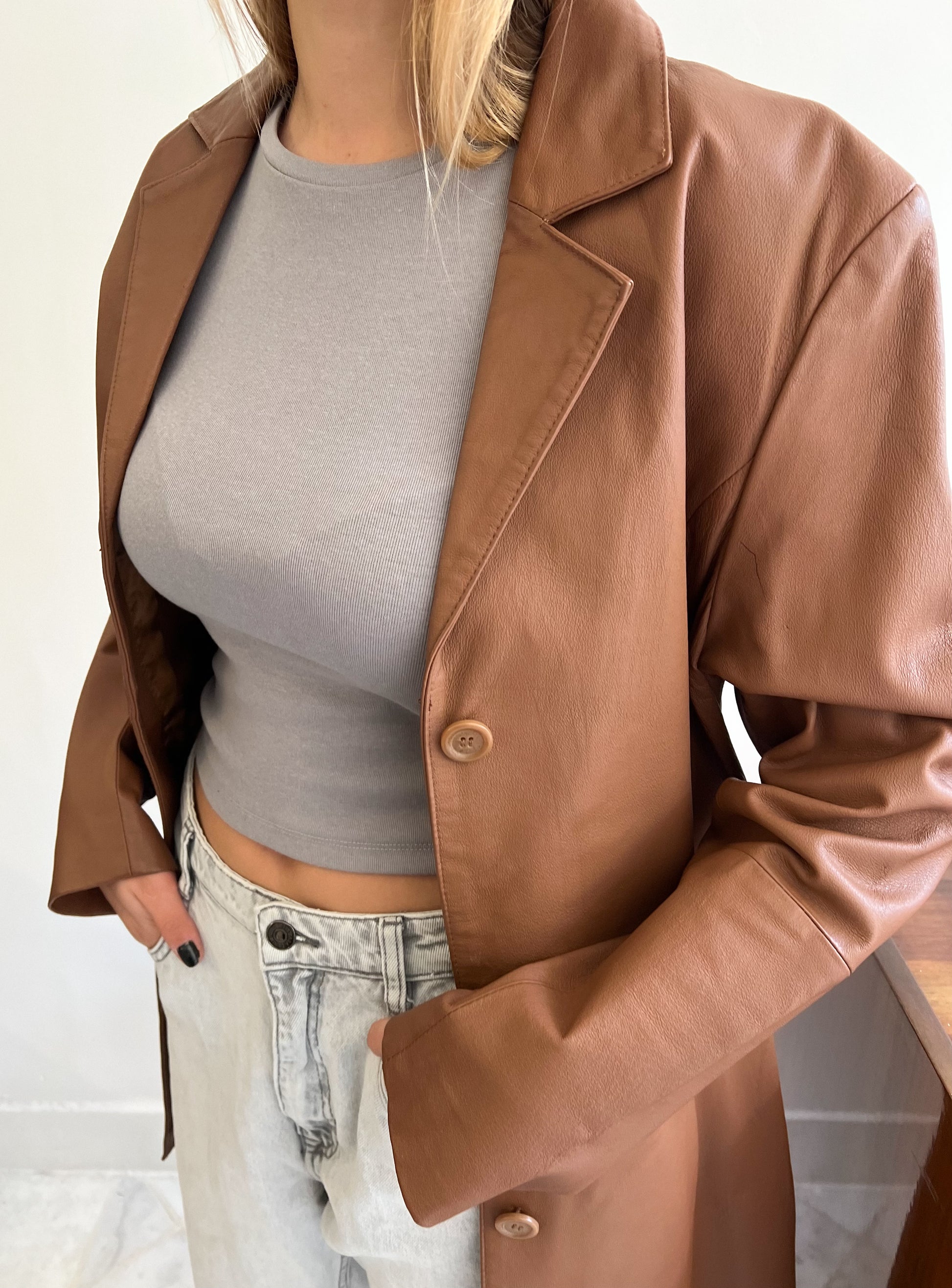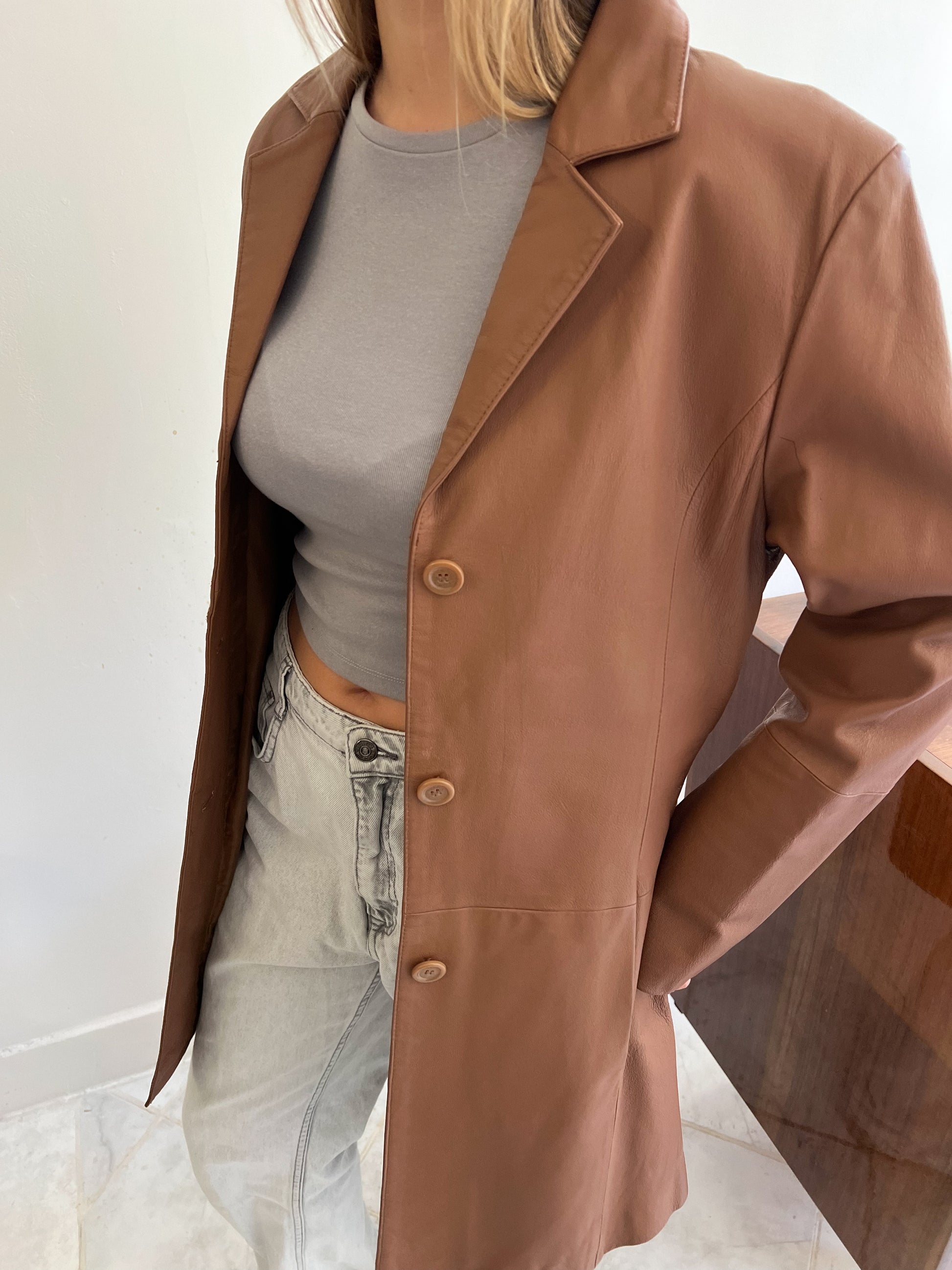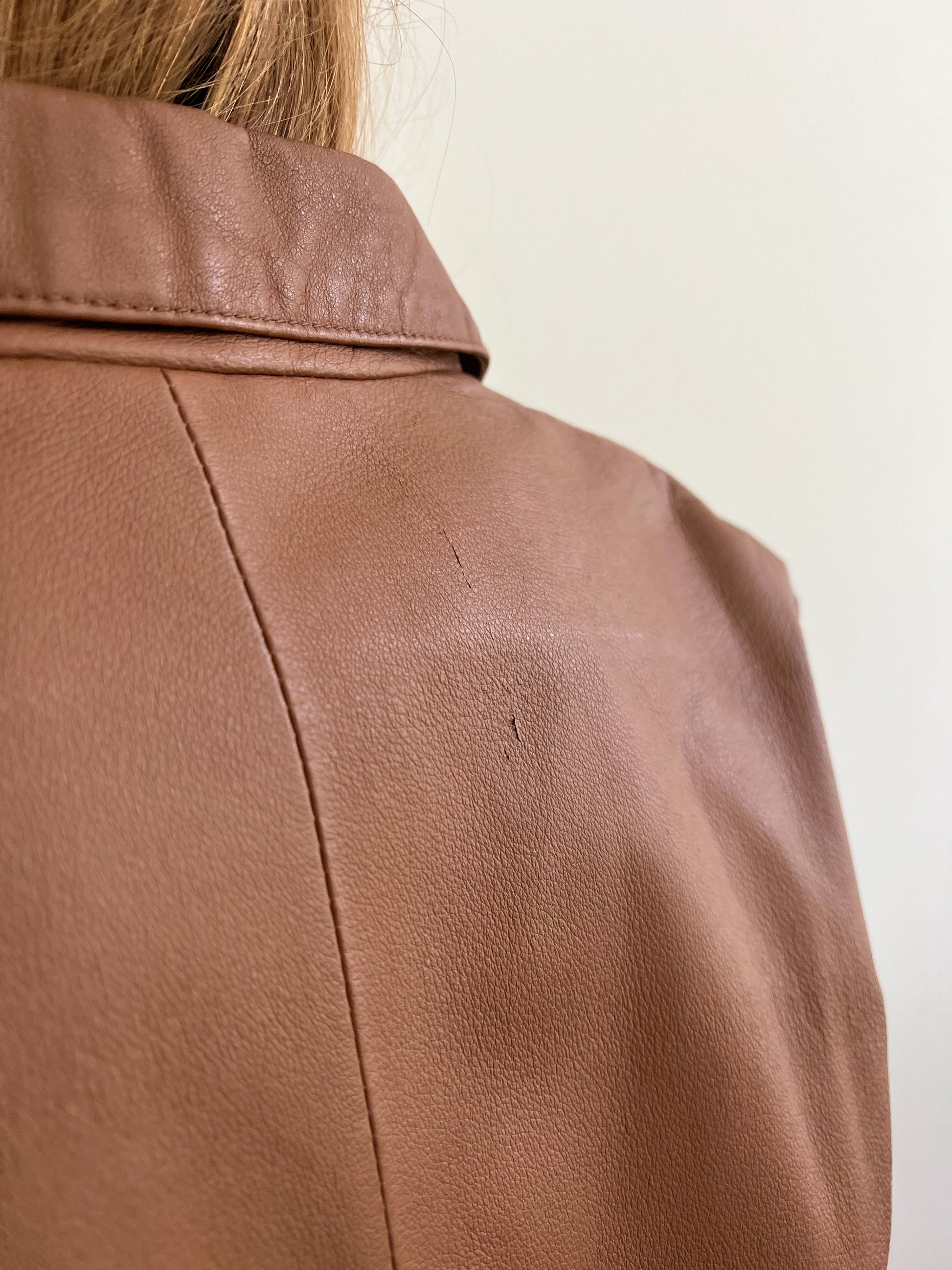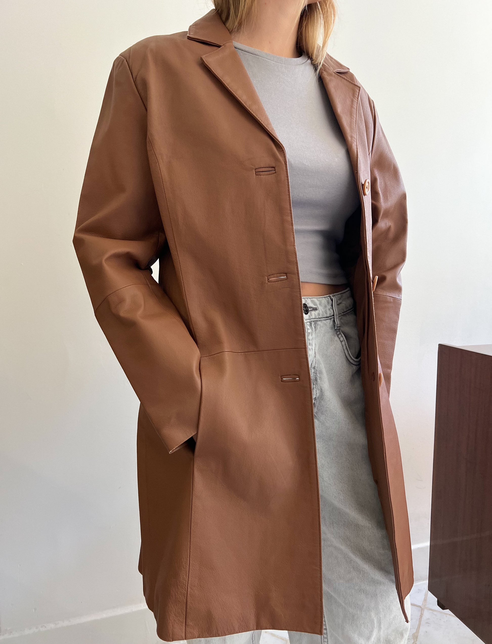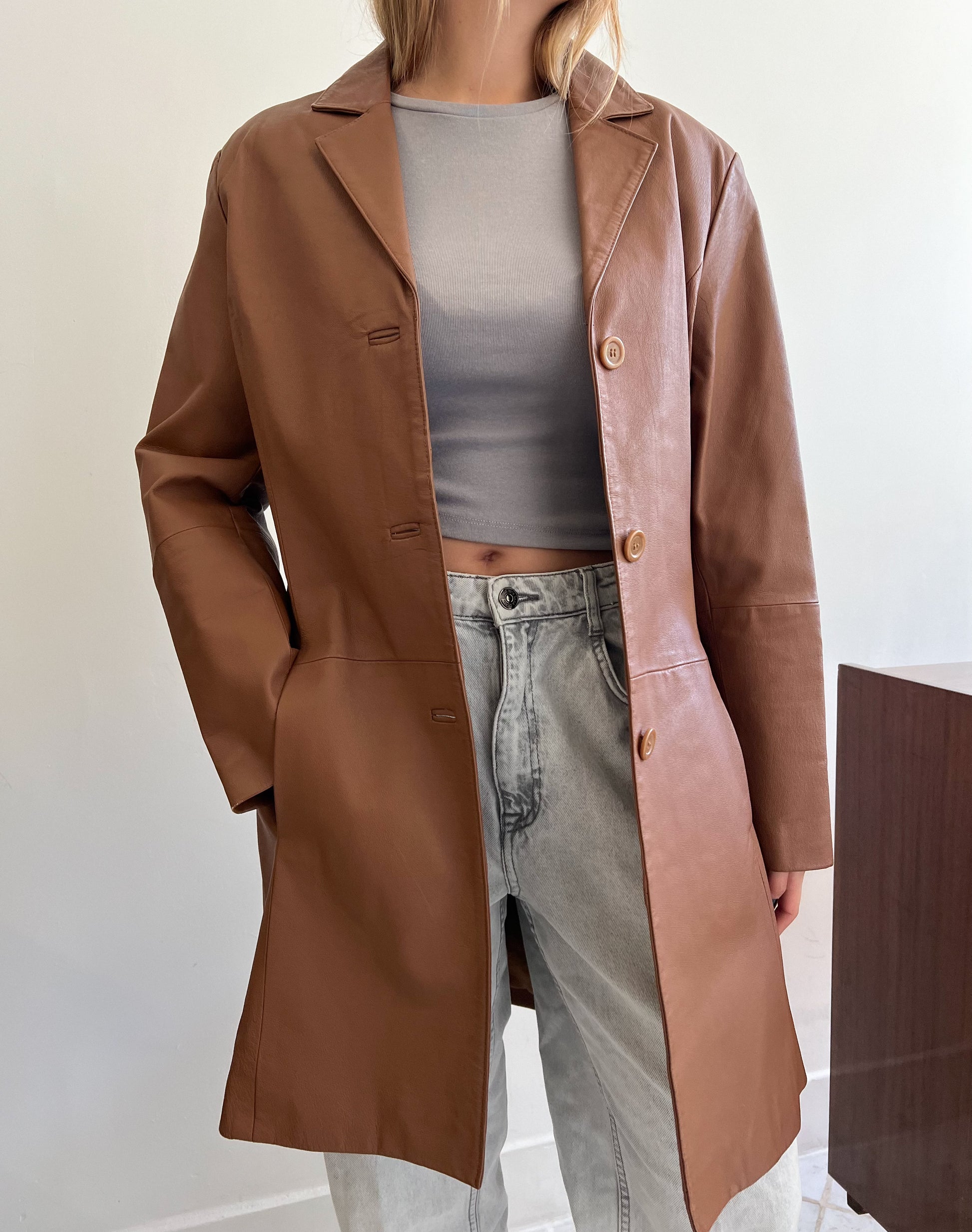Płaszcz ze skóry naturalnej w odcieniu ciepłego brązu, rozmiar M. Klasyczny, prosty fason z kołnierzem i zapięciem na guziki. Skóra o zwartej, twardszej strukturze, która pięknie trzyma formę i nadaje całości wyrazisty charakter. Wewnątrz podszewka z poliestru. Stan bardzo dobry z naturalnymi śladami użytkowania. Z tyłu delikatne ryski widoczne na zdjęciu, typowe dla tego typu skóry. Ponadczasowy model o minimalistycznym kroju, który świetnie wygląda zarówno w codziennych, jak i bardziej eleganckich zestawach.