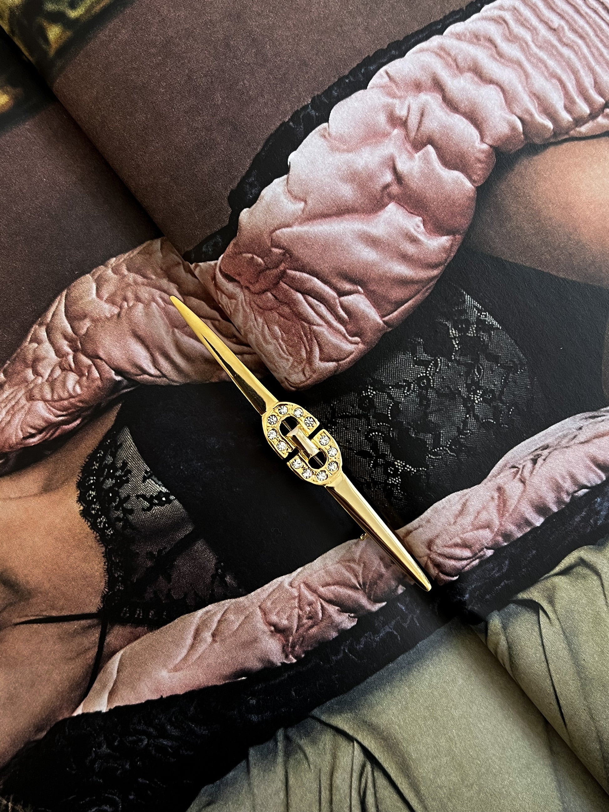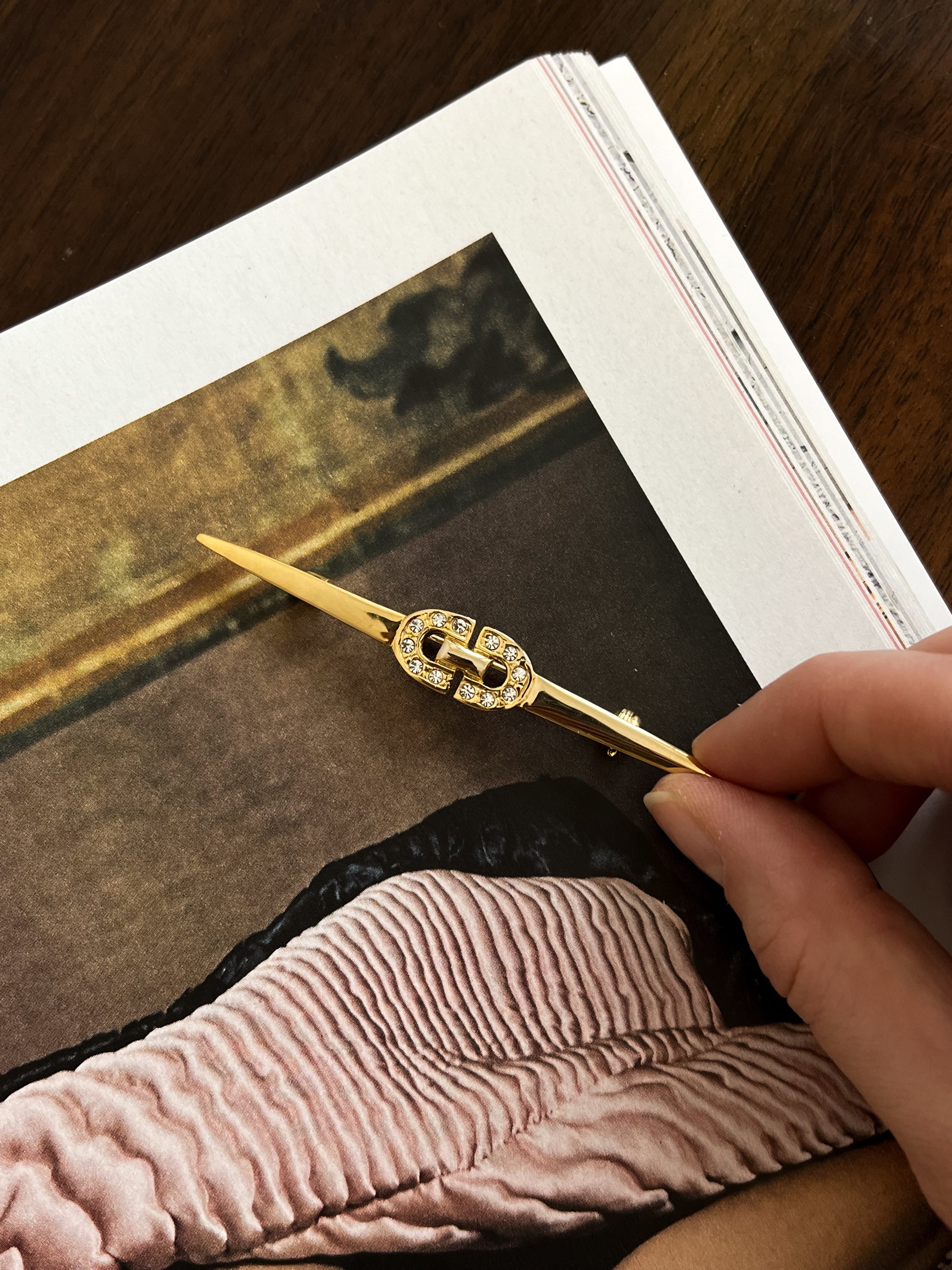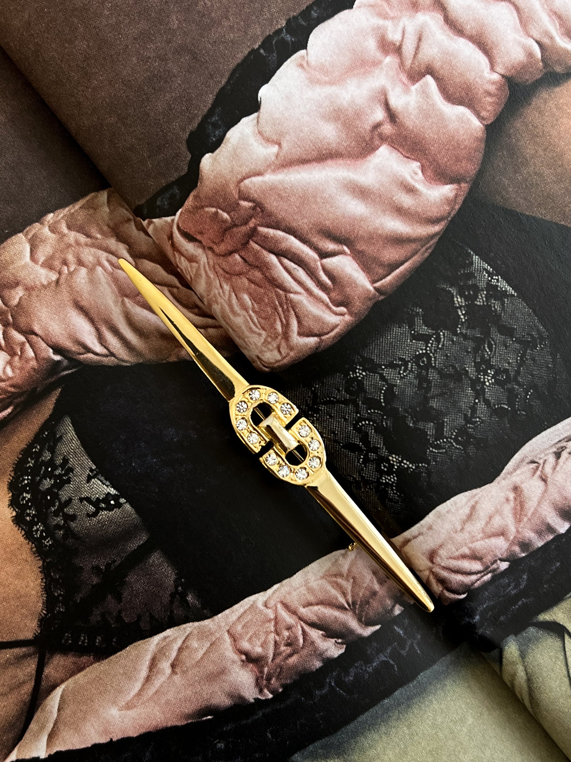 Długa złota broszka z subtelnym geometrycznym emblematem wysadzanym drobnymi kryształkami. Projekt utrzymany w eleganckim stylu lat 80., ale wykonanie wskazuje na produkcję z przełomu lat 90'/00' charakterystyczną dla tego okresu minimalistyczną linią i precyzyjnym, delikatnym zdobieniem.