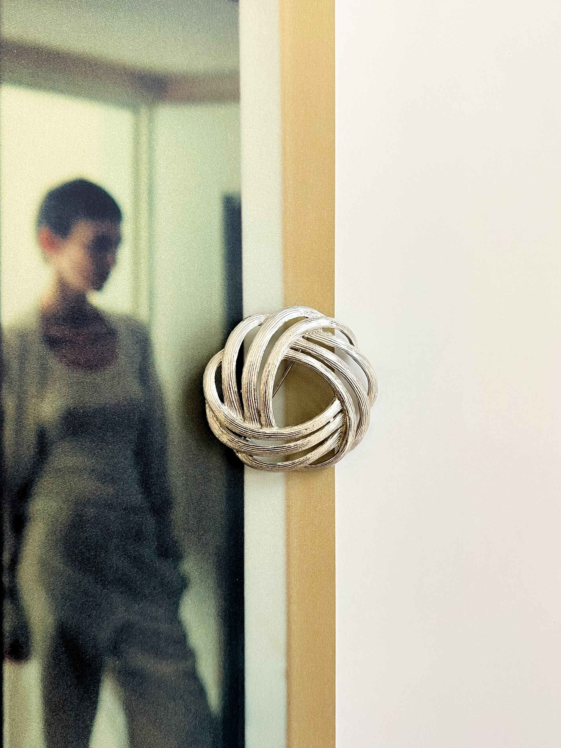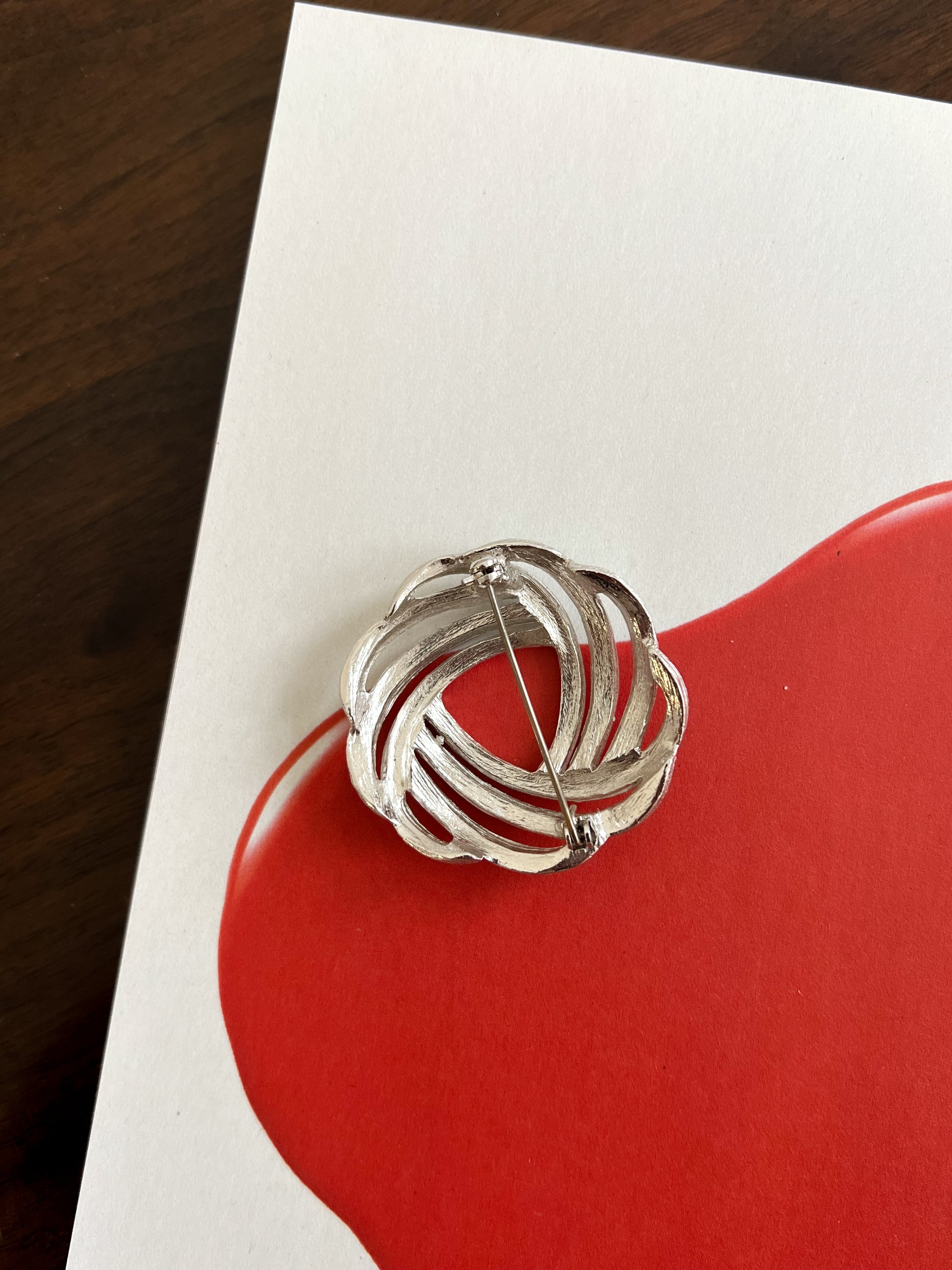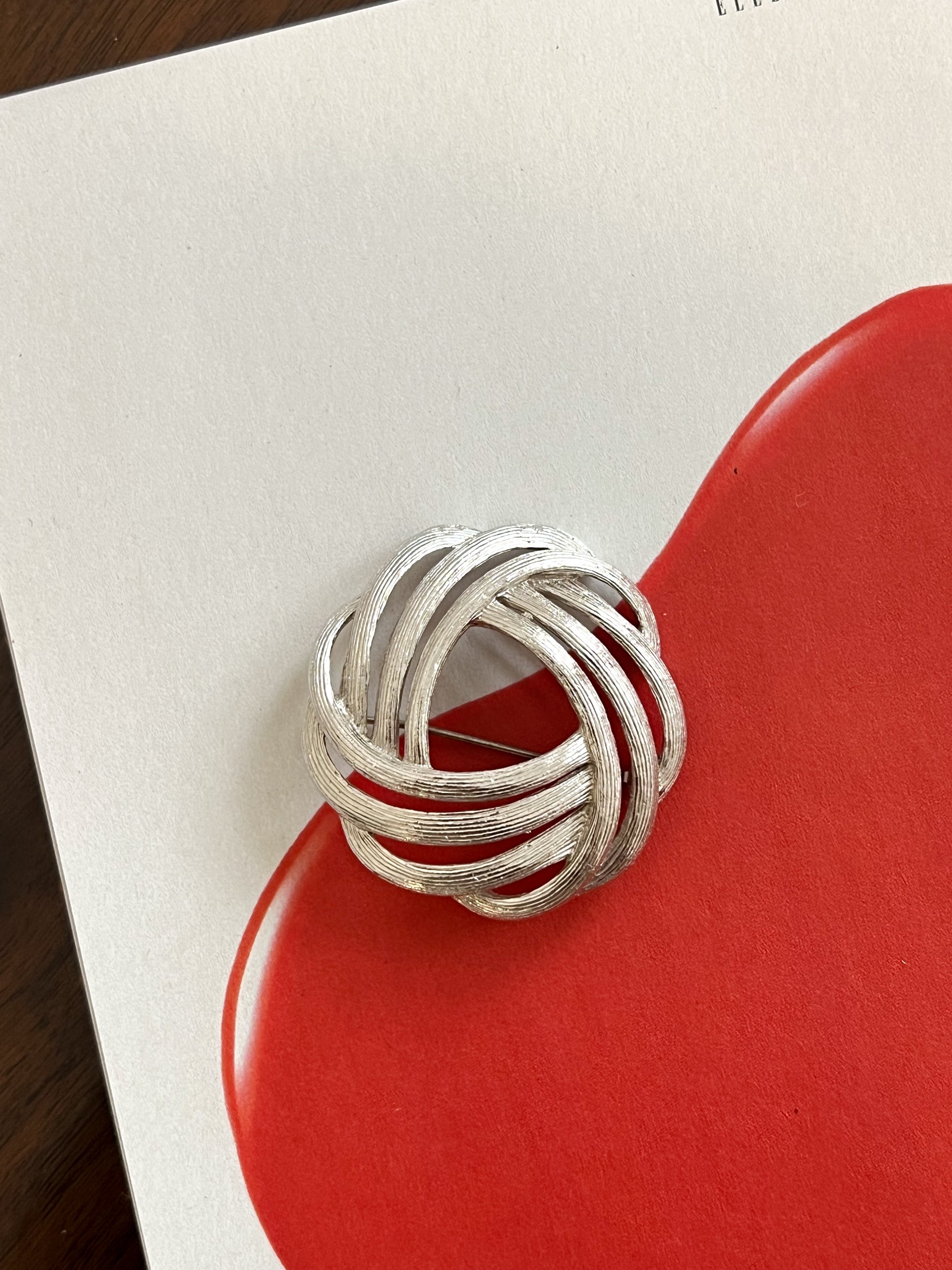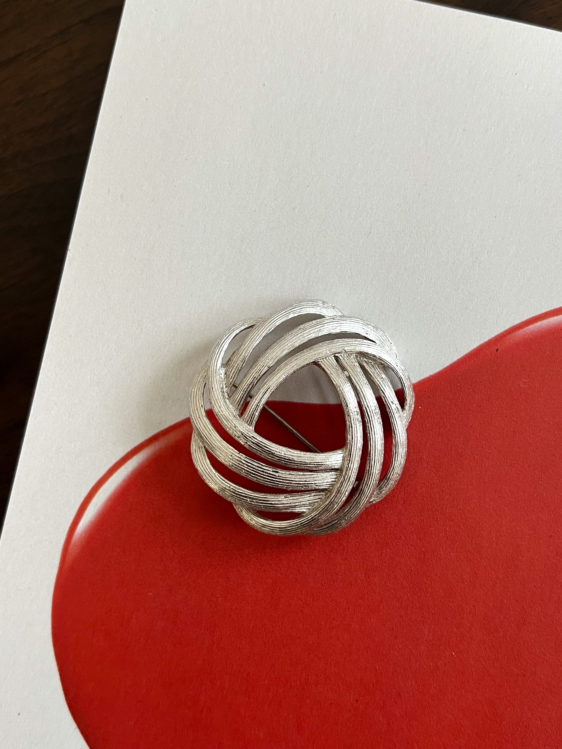 Elegancka vintage broszka o formie przestrzennego, przeplatanego węzła. Wykonana z lekkiego, srebrzystego stopu ze szczotkowaną fakturą, detal charakterystyczny dla biżuterii kostiumowej z końca lat 70. i początku 80., kiedy popularne były strukturalne, rzeźbione powierzchnie. Subtelnie połyskuje i pięknie układa się na płaszczu lub marynarce.