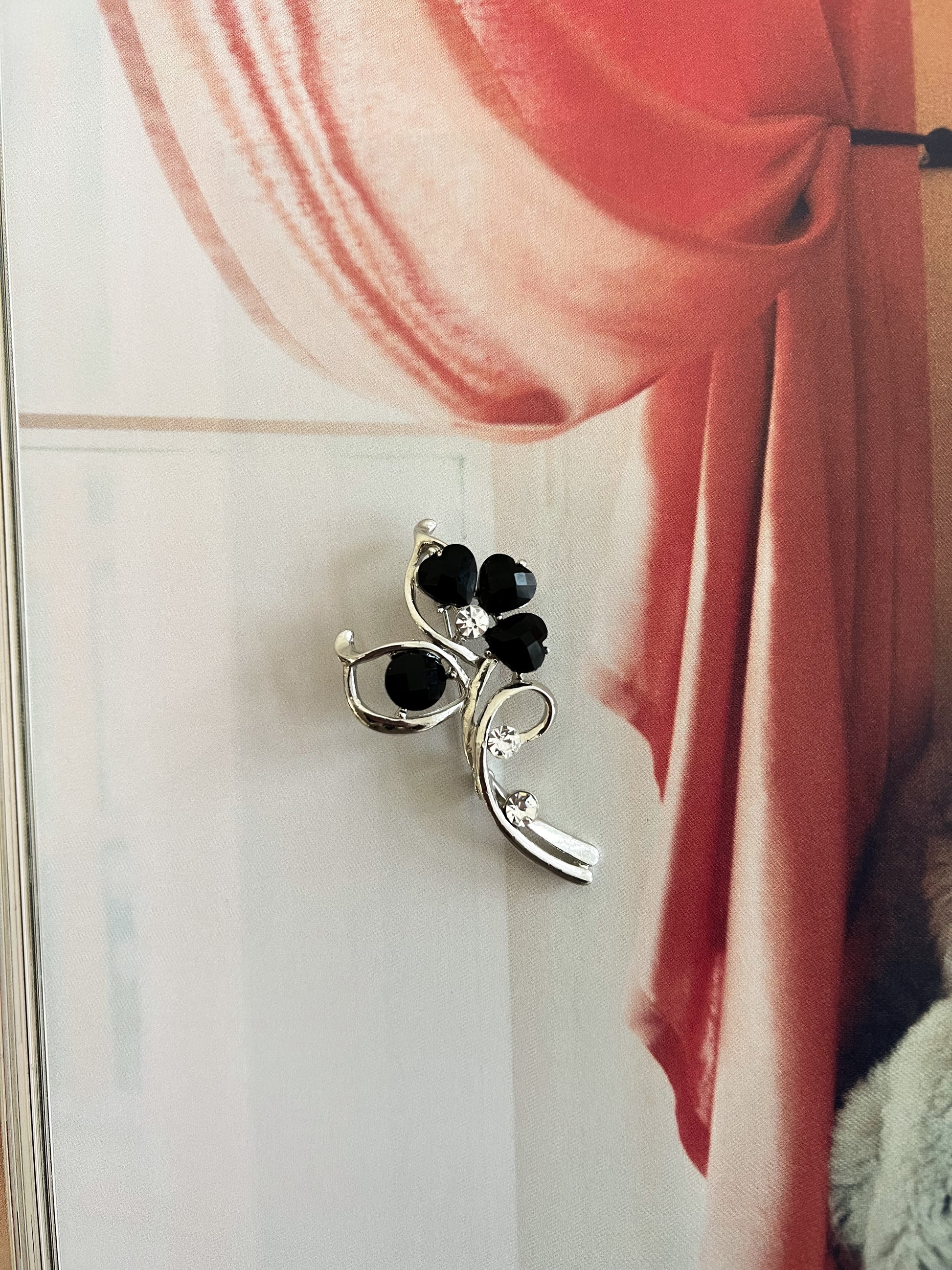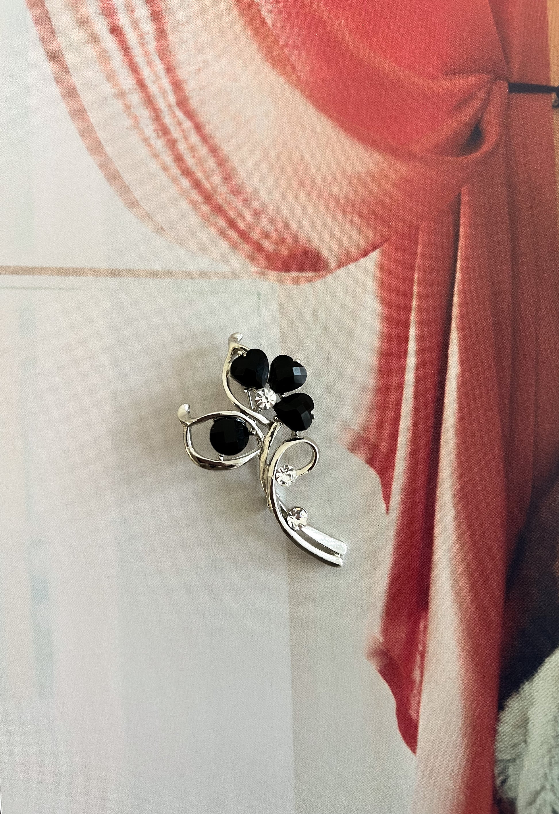Srebrzysta broszka z czarnymi kamieniami i cyrkonią | 00'
