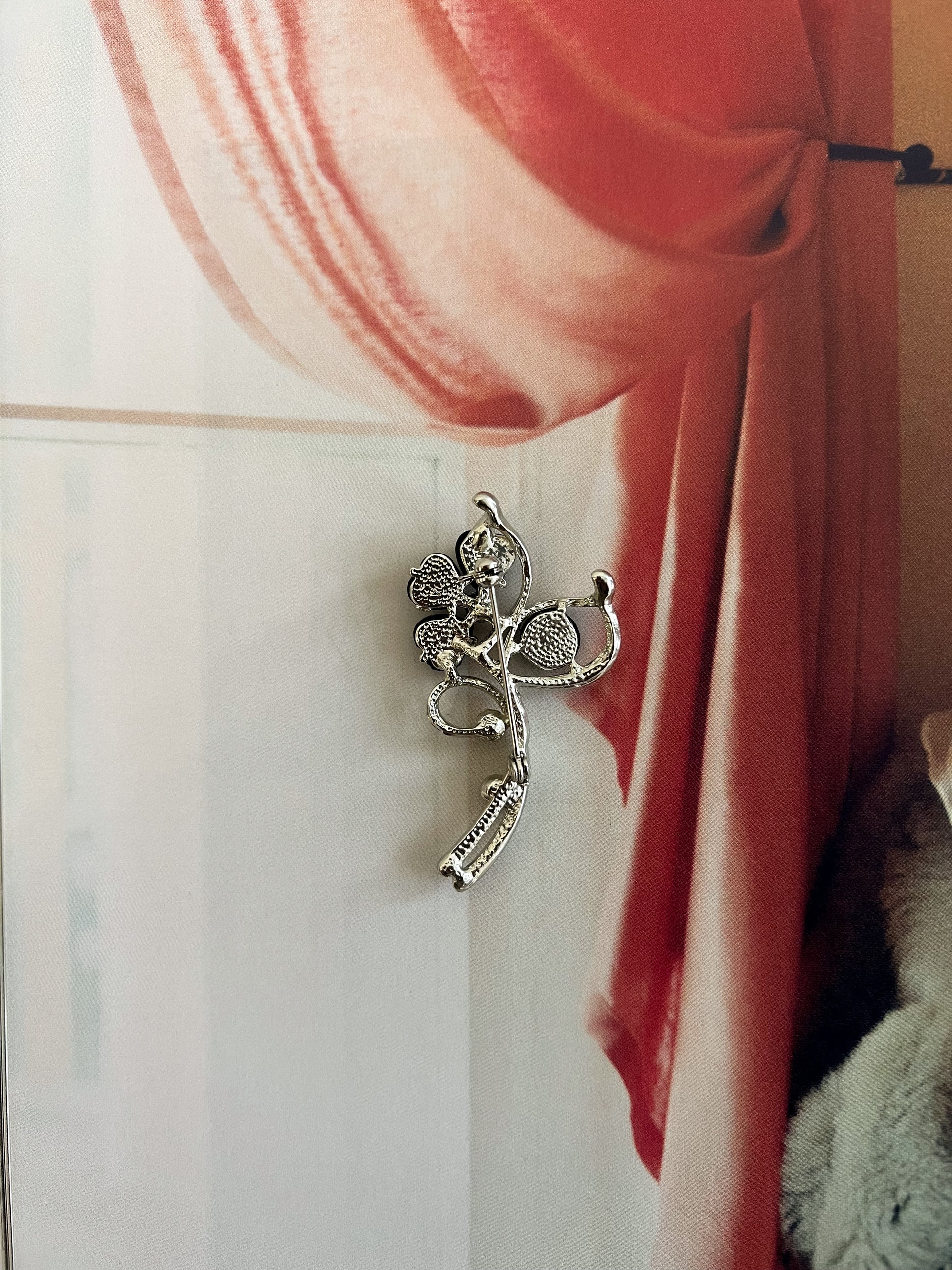 Lekka broszka o delikatnej, florystycznej linii, zdobiona czarnymi, fasetowanymi kamieniami i jasnymi kryształkami. Typowa dla początku 00’, kiedy łączono motywy roślinne z nowoczesnym, srebrzystym wykończeniem. Subtelna i elegancka.