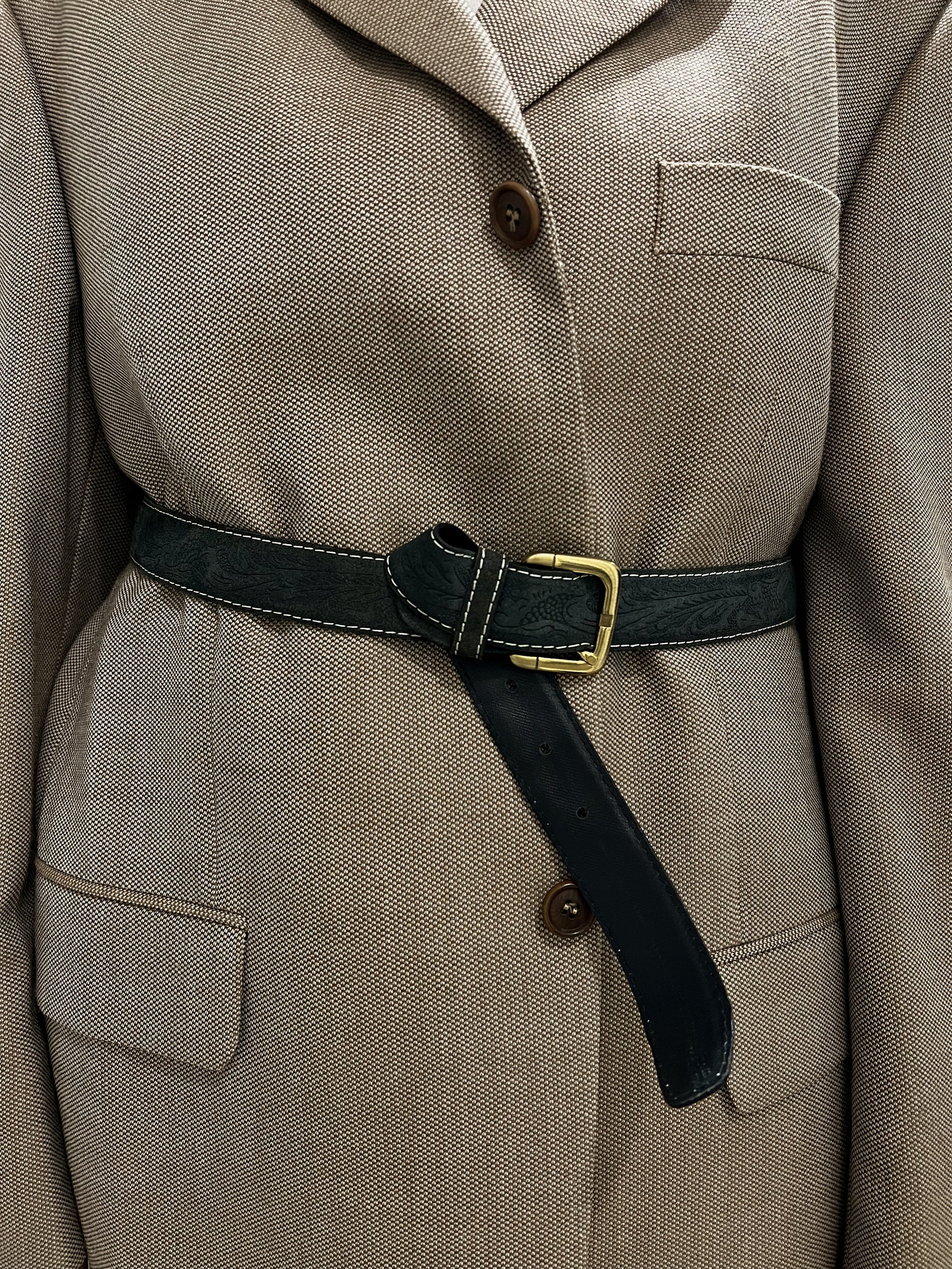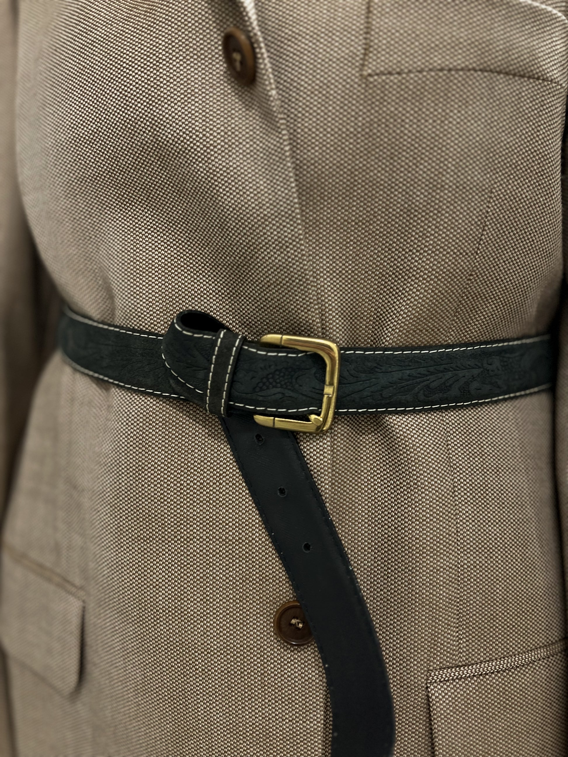 Miękka, naturalna skóra z roślinnym tłoczeniem i kontrastową nicią tworzy ponadczasowy, lekko westernowy charakter. Złota klamra dodaje mu elegancji. Stan bardzo dobry, z delikatnymi śladami noszenia. rozmiar na pasku 105/120