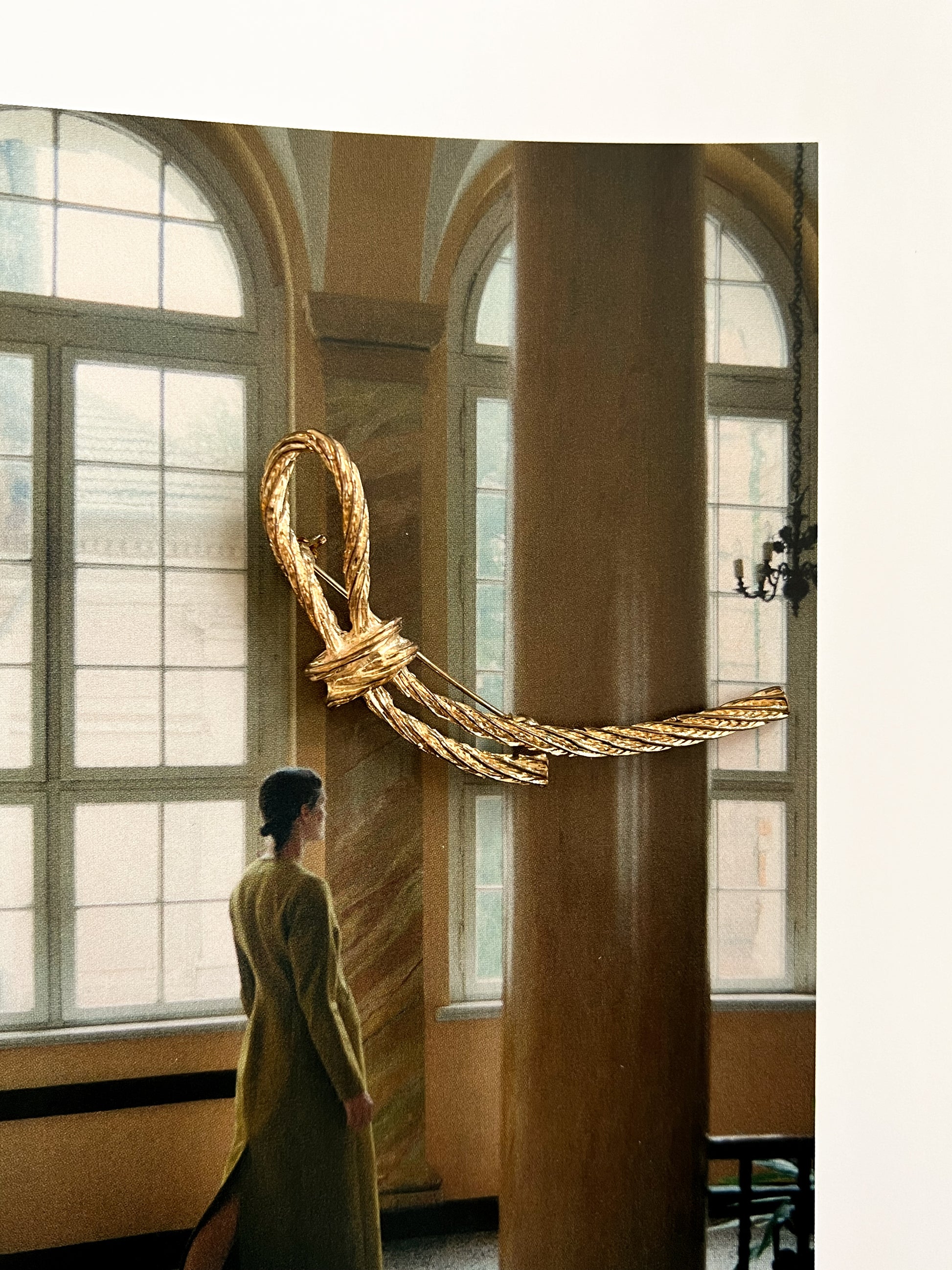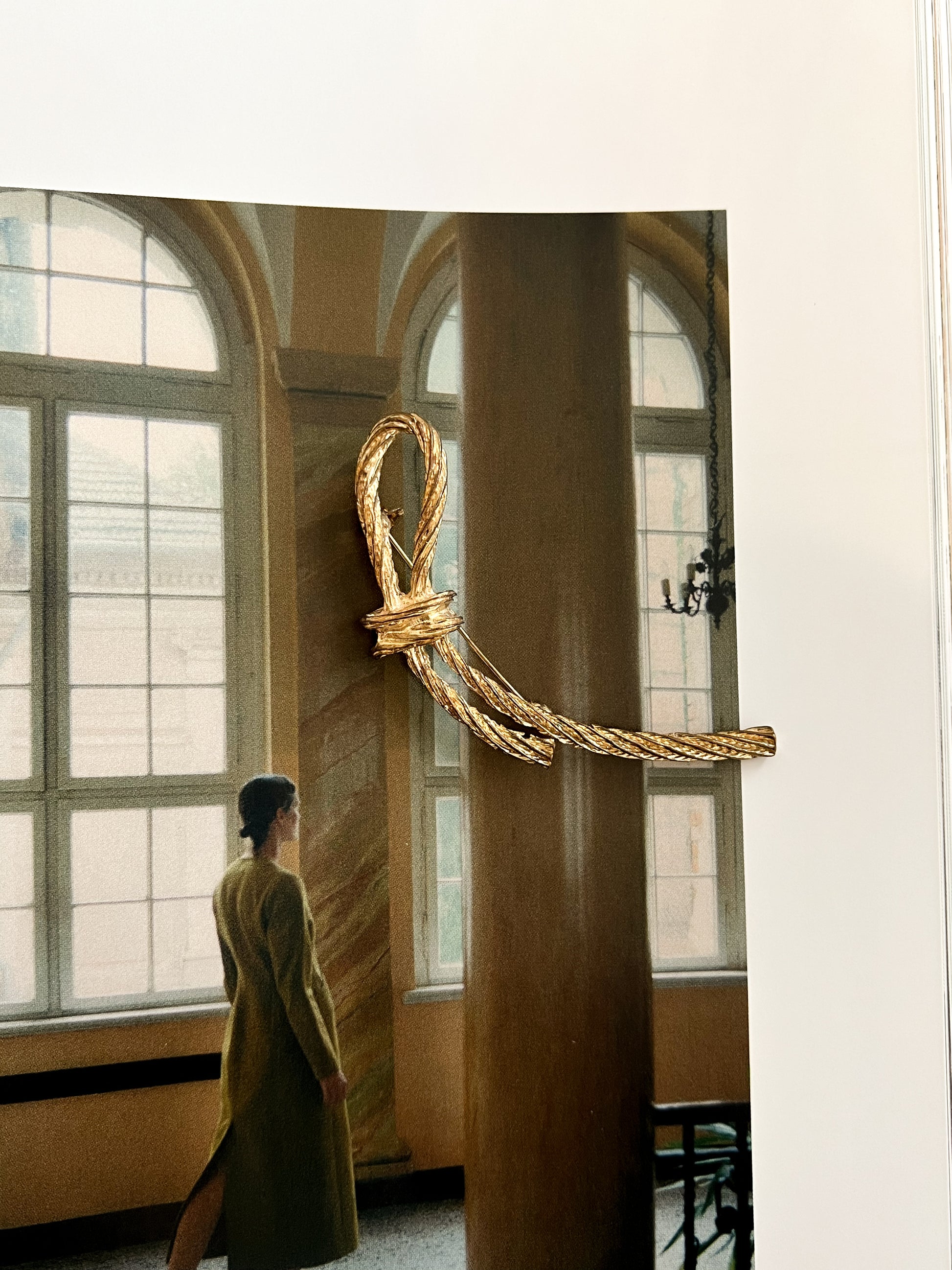 Dekoracyjna broszka o formie złotego supełka z charakterystyczną, plecioną fakturą typową dla 90’ 00'. Choć metal jest już miejscami delikatnie zdarty, całość została ładnie zebrana i prezentuje się spójnie. Lekko asymetryczna linia dodaje jej elegancji w stylu vintage.